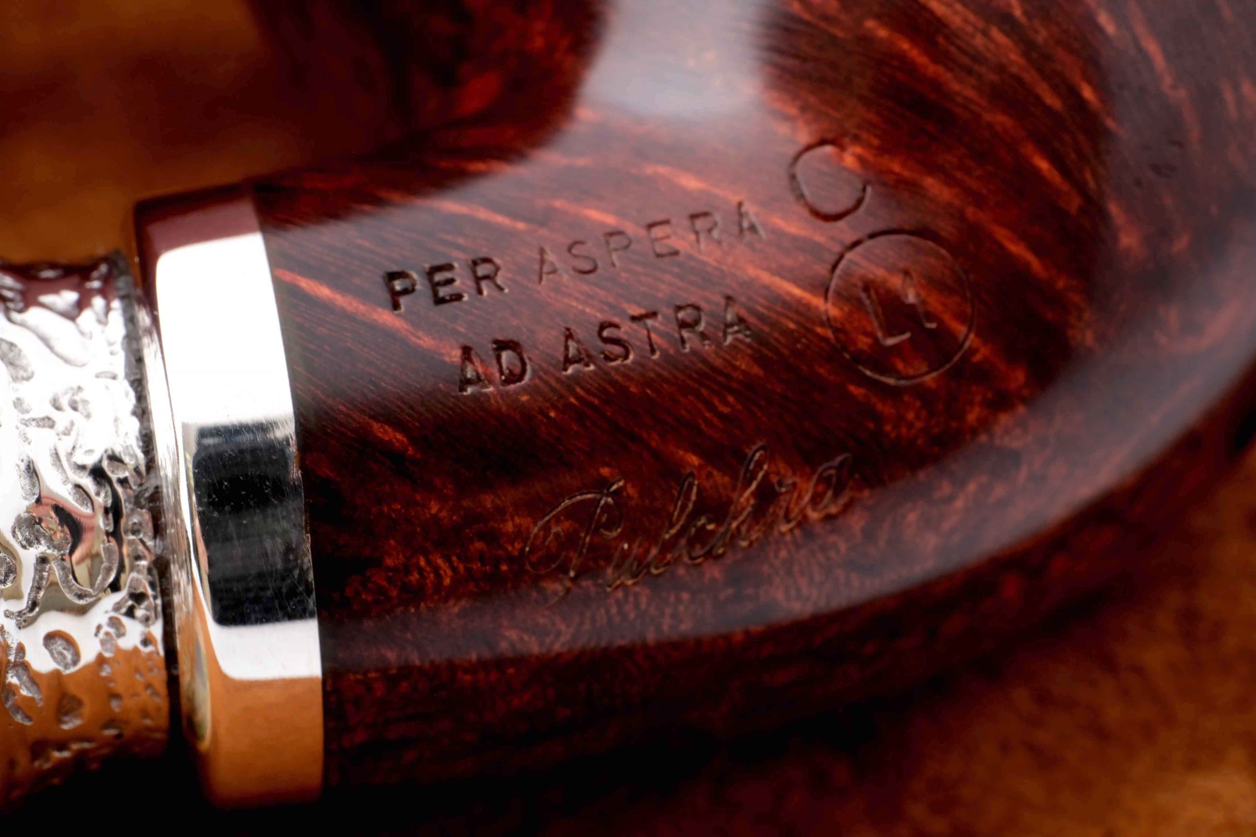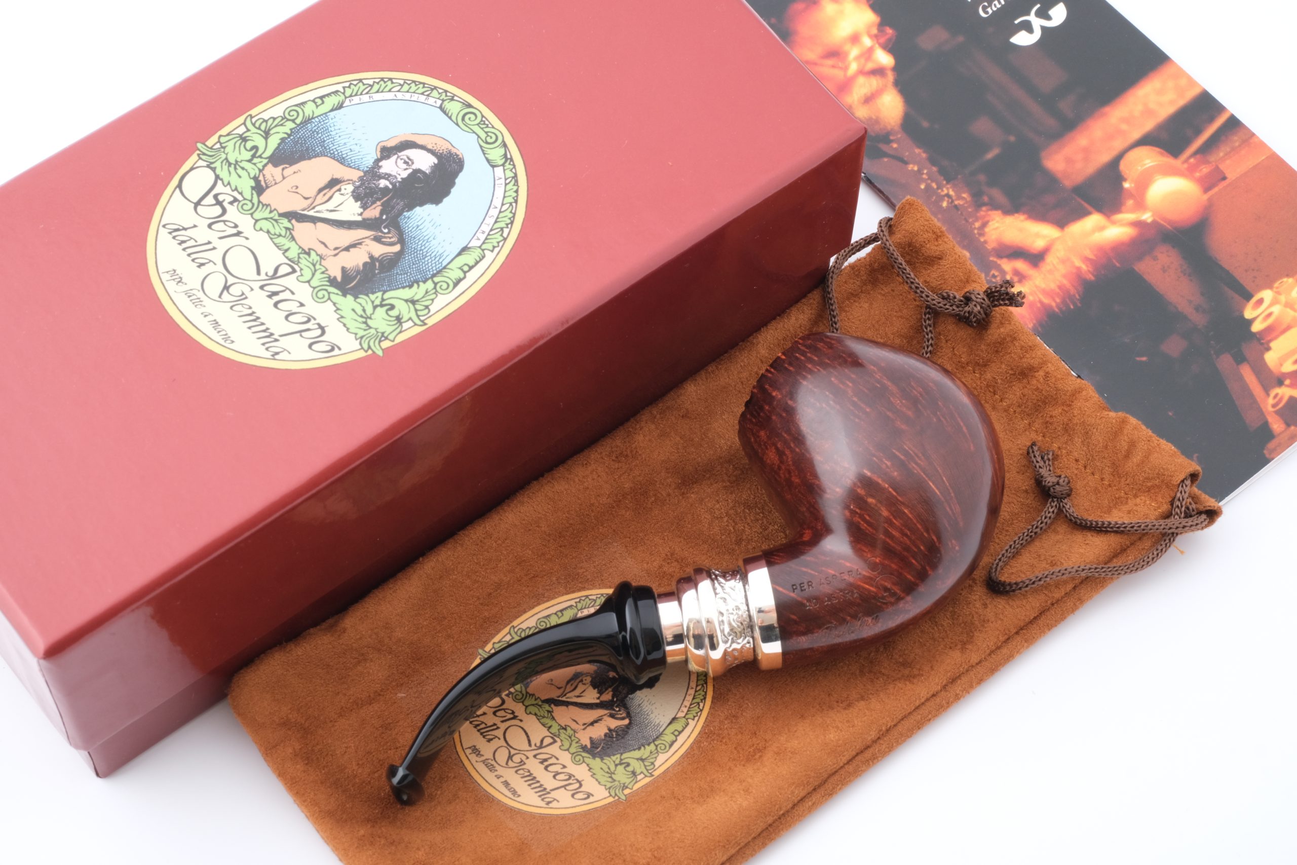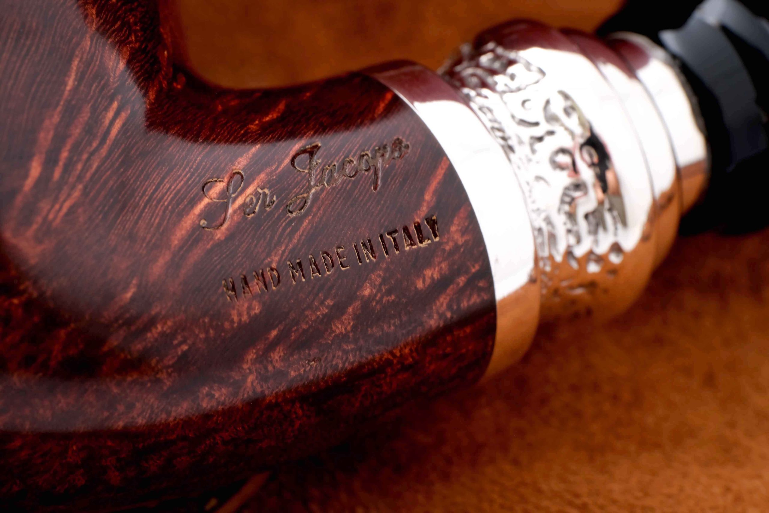 На трубке выбит девиз мастерской Ser Jacopo PER ASPERA AD ASTRA («Через тернии к звездам», лат.), маркировки: Ser Jacopo, Hand made in Italy, грэйд L1 C.
