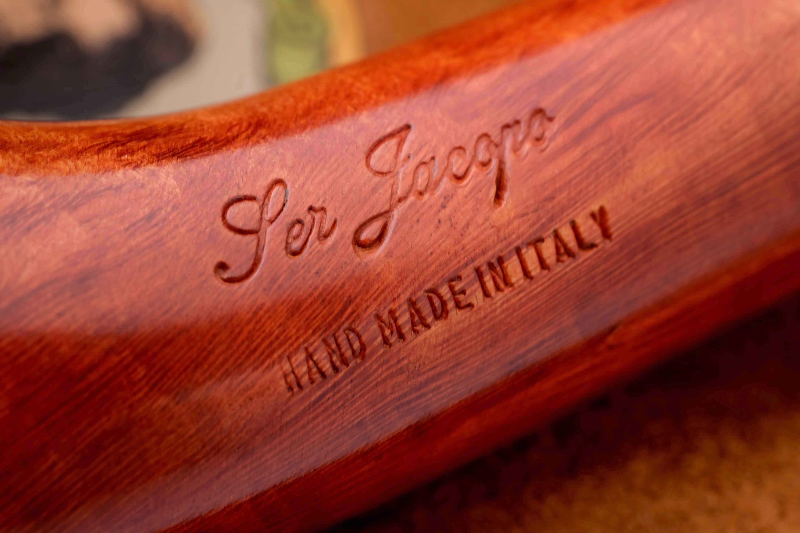 На трубке выбит девиз La Fuma fiche tira («Дымится пока курится», ит.), маркировки: Ser Jacopo, Hand made in Italy