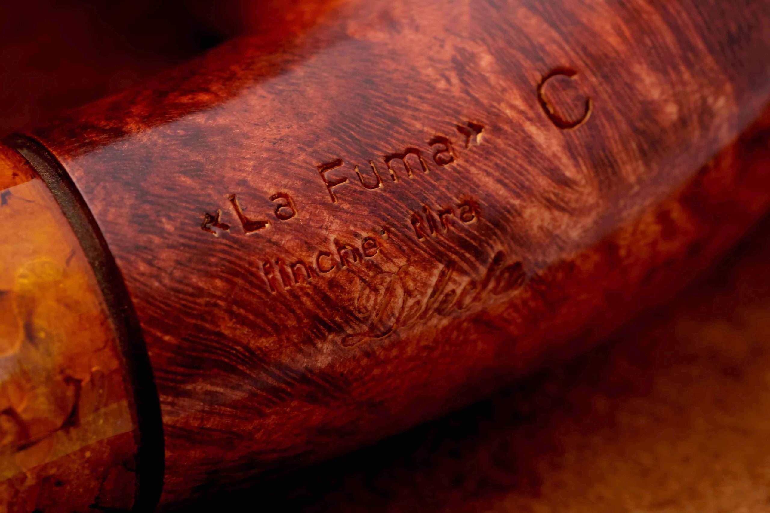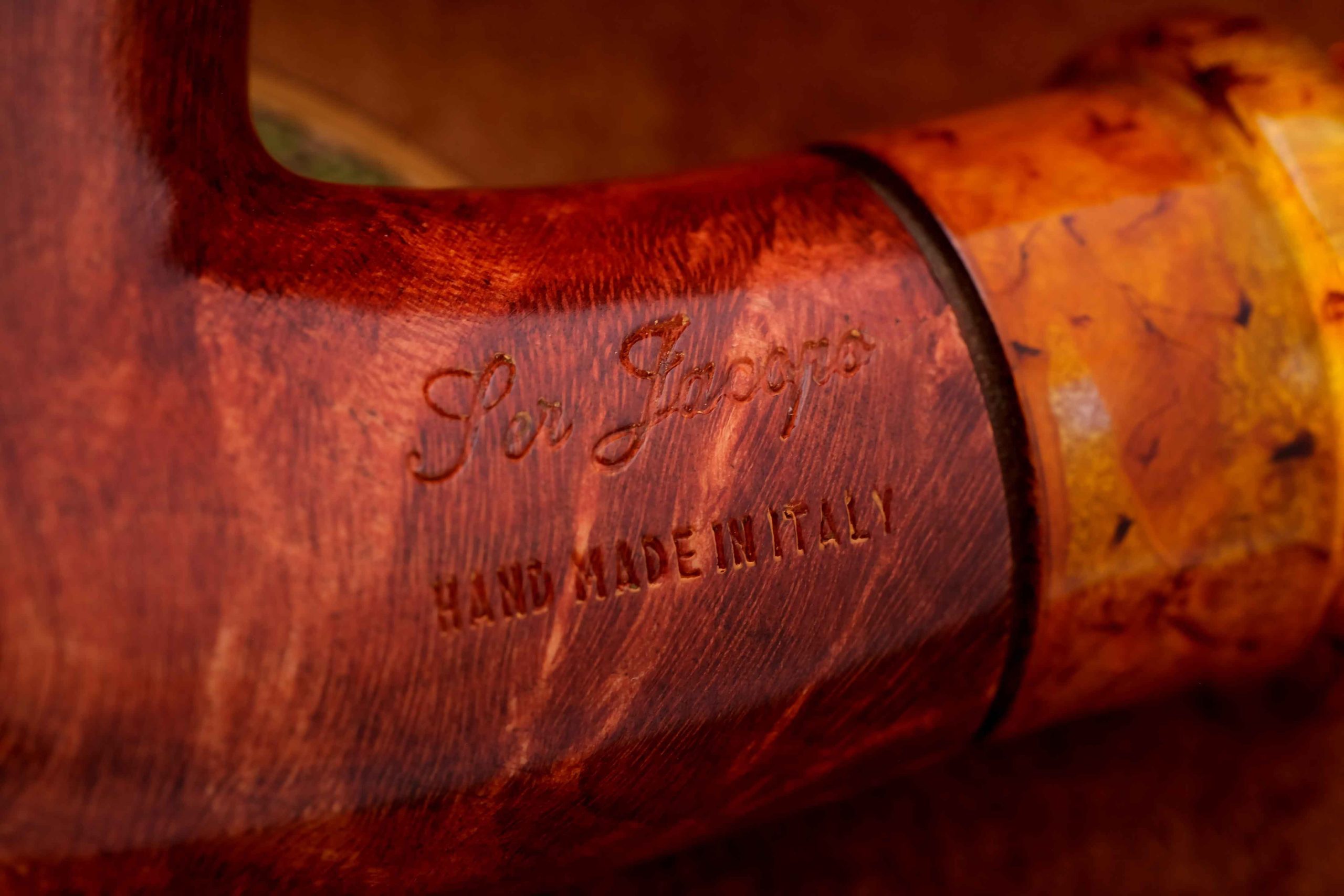 На трубке выбит девиз La Fuma fiche tira («Дымится пока курится», ит.), маркировки: Ser Jacopo, Hand made in Italy.