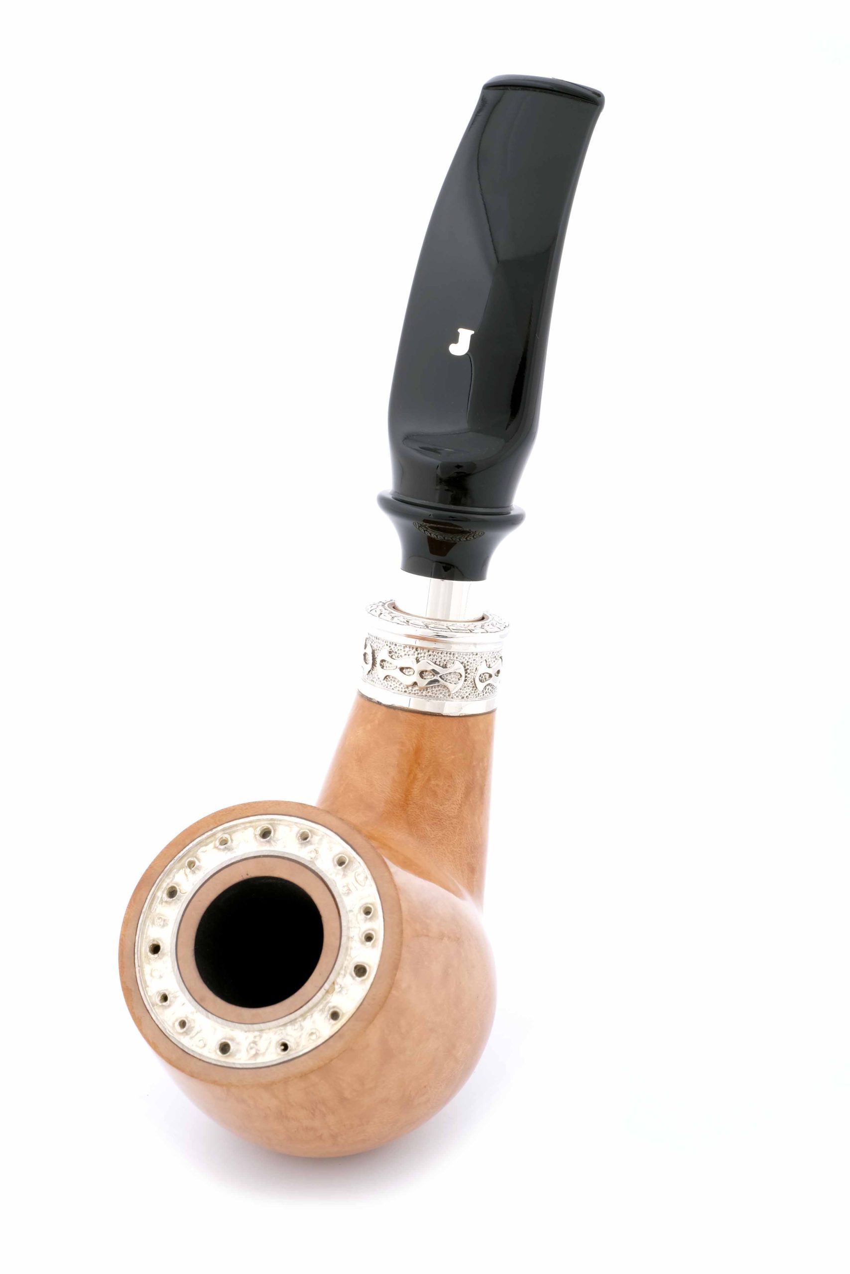 Джанкарло разработал аналогичную, но уже из бриара: в стенках чашки сделана кольцевая проточка, закрытая сверху серебряной крышкой с отверстиями для отвода тепла.