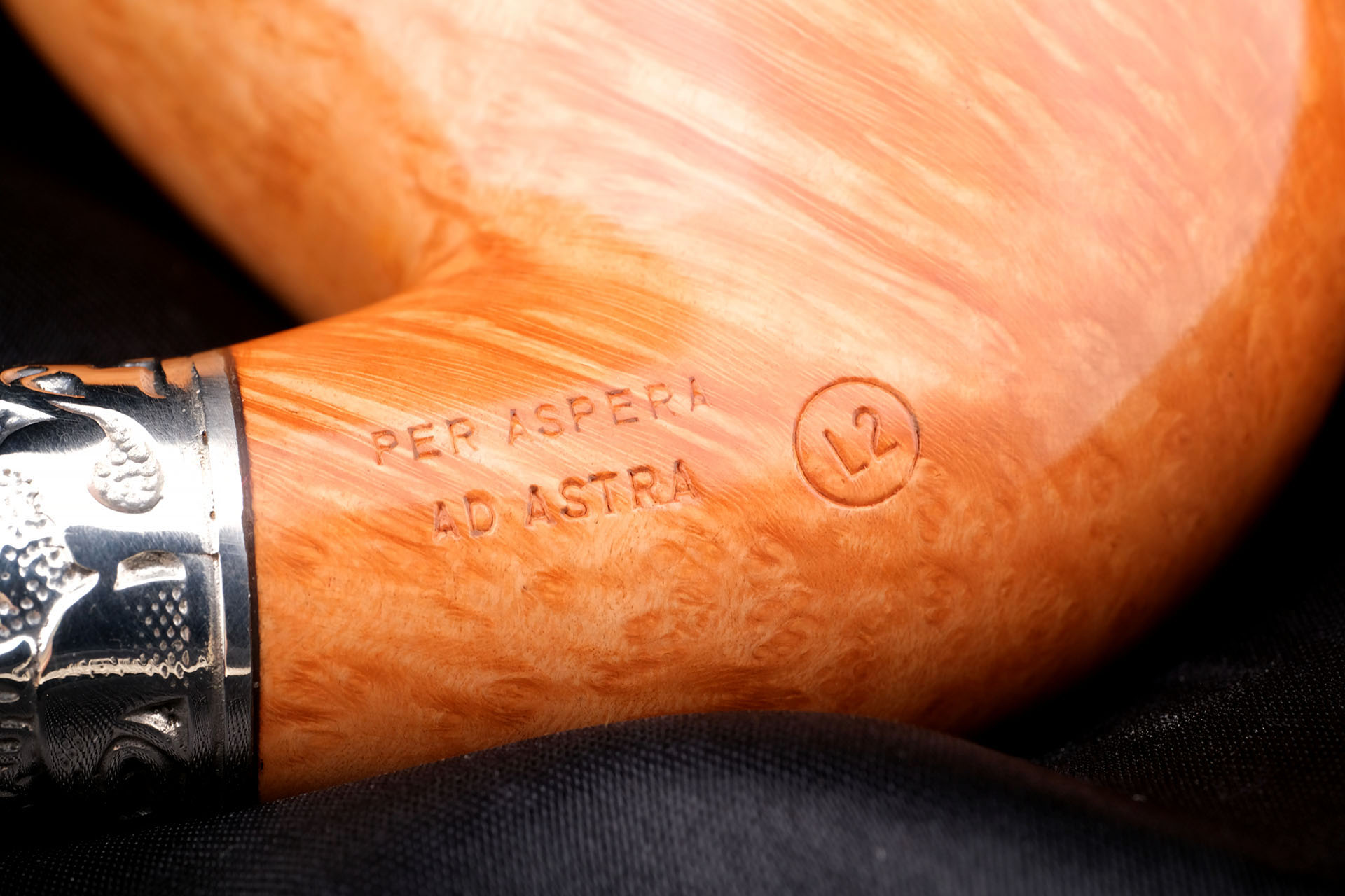 На трубке выбит девиз мастерской Ser Jacopo "PER ASPERA AD ASTRA" ( Через тернии к звездам, лат.), маркировки: Ser Jacopo, Historica, Nauta, Hand made in Italy, грэйд L2 и уникальный номер.