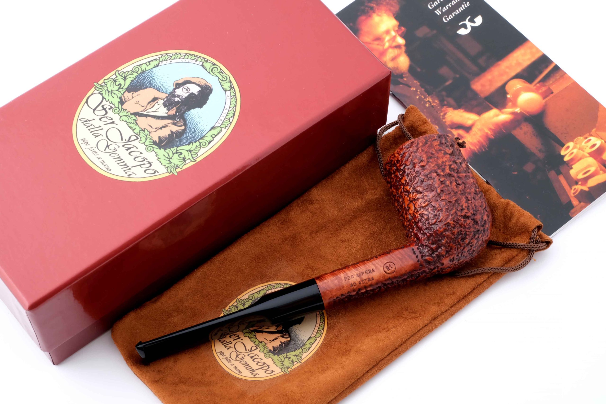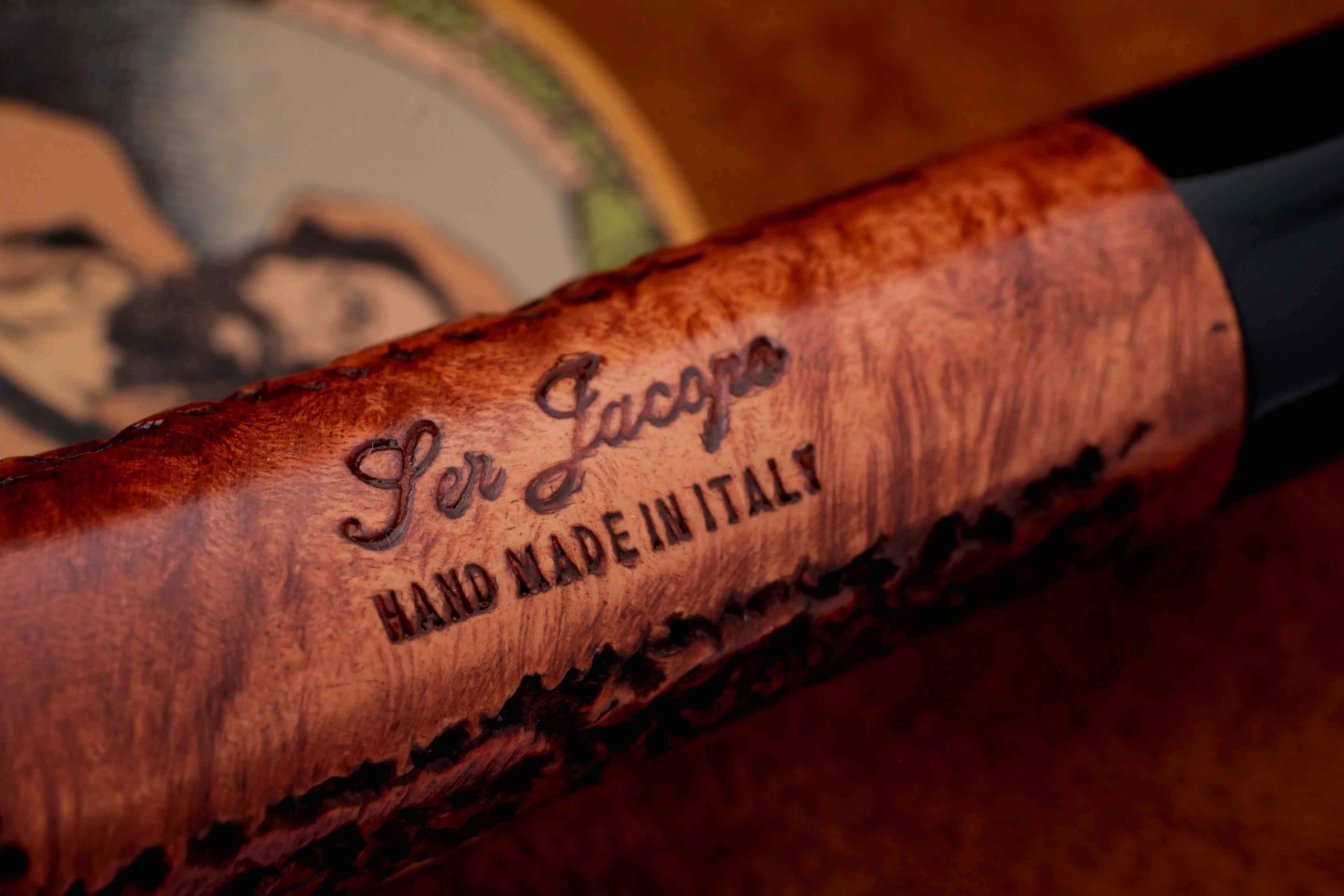 На трубке выбит девиз мастерской Ser Jacopo PER ASPERA AD ASTRA («Через тернии к звездам», лат.), маркировки: Ser Jacopo, Hand made in Italy