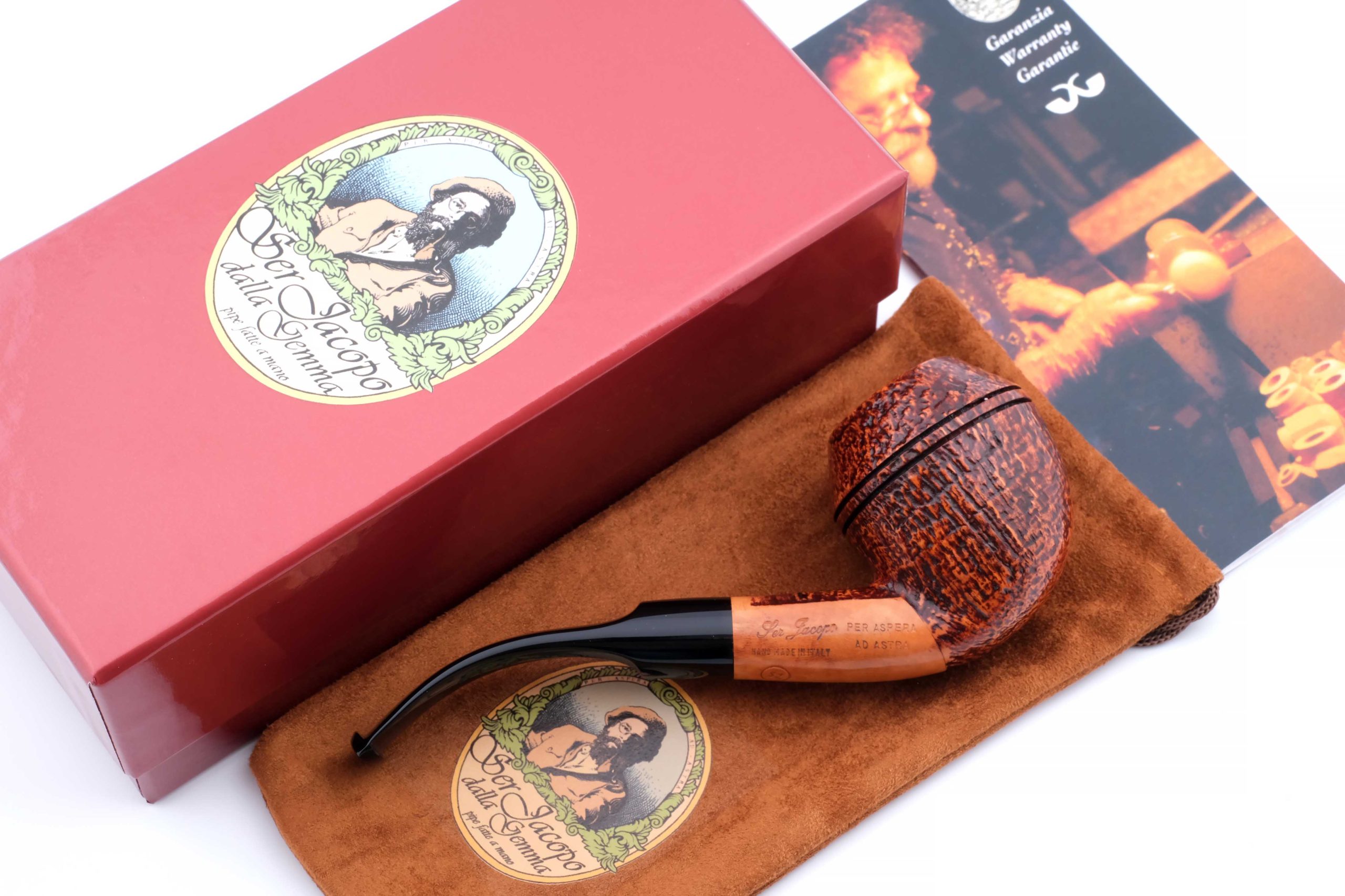 На трубке выбит девиз мастерской Ser Jacopo PER ASPERA AD ASTRA ("Через тернии к звездам", лат.), маркировки: Ser Jacopo, Hand made in Italy, грэйд S2.