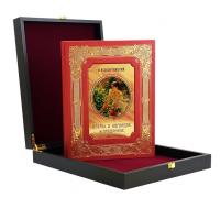 Дизайн прекрасно сочетает в себе золотое и блинтовое тиснение, художественную металлическую вставку, соответствующую тематике издания, а также крашенный в тон переплетного материала обрез.