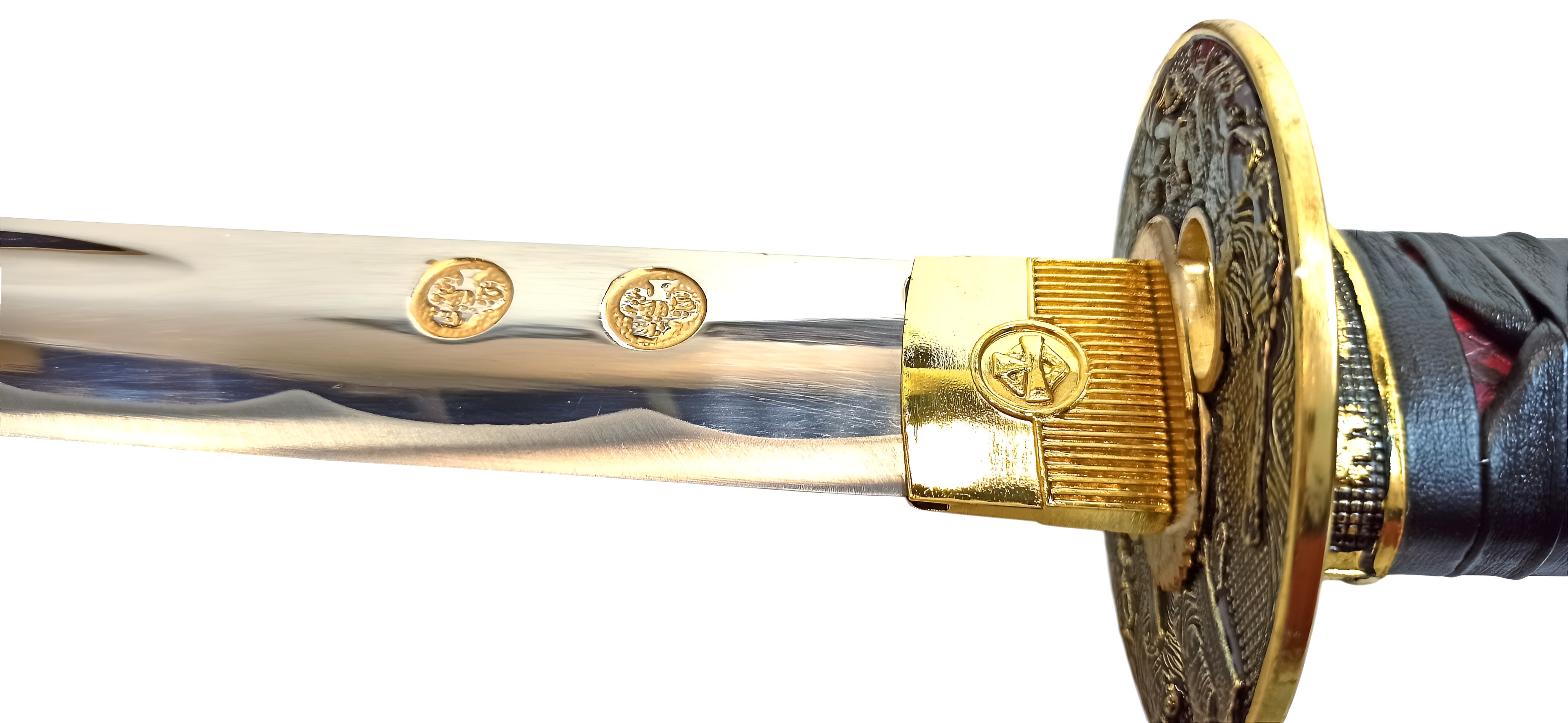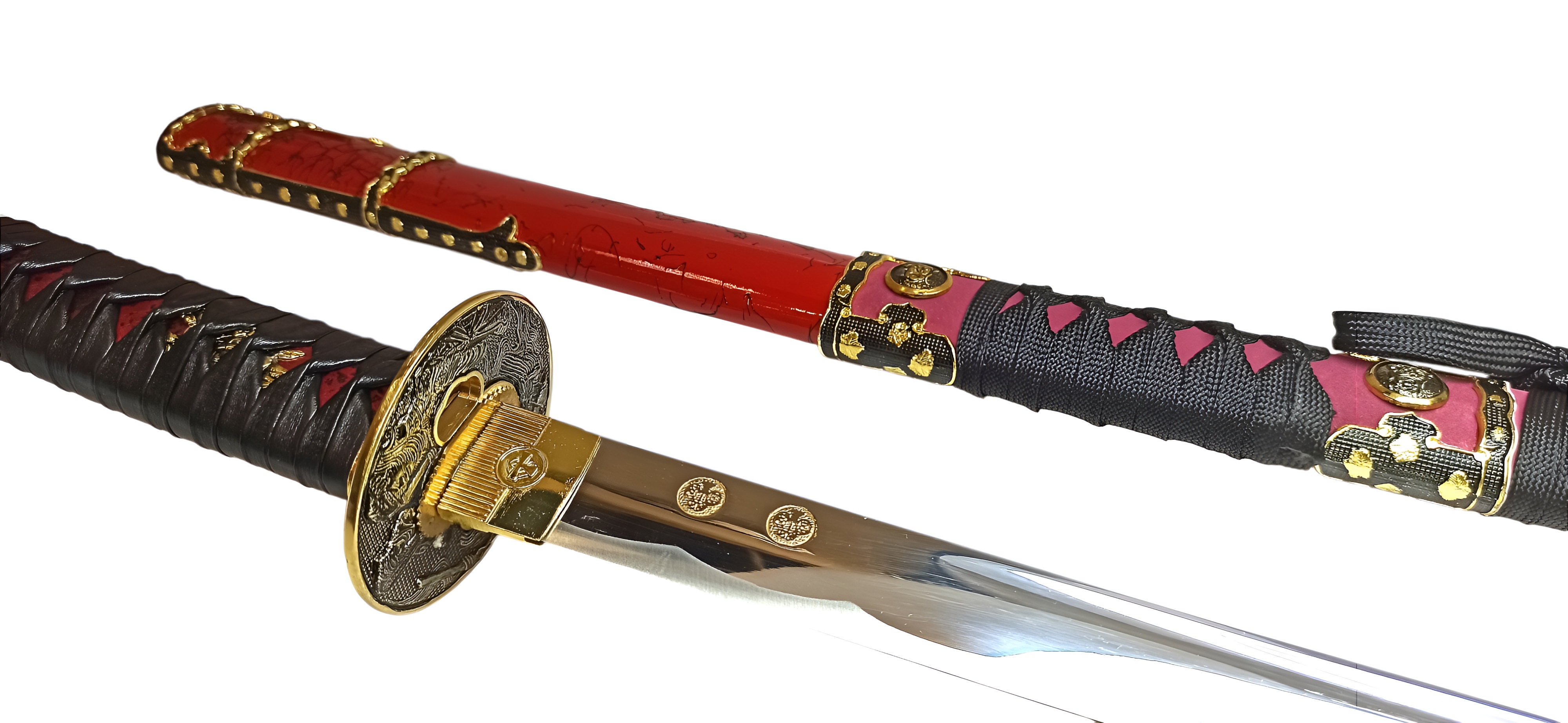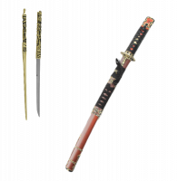Вакидзаси "Токугава" с двумя ножами (когаи и козука). Цуба с японскими мотивами. Цука оклеена красной кожей, имитирующей змеиную и обмотана цука-ито из черной кожи. Лезвие изготовлено из нержавеющей стали марки 420С (25 HRC) с высокотехнологичной обработкой (полировкой) и не заточено. Деревянные лакированные ножны (сая) красно-черного цвета с сагео черного цвета. В верхней части ножен имеется накладка из кожи с металлическими вставками.