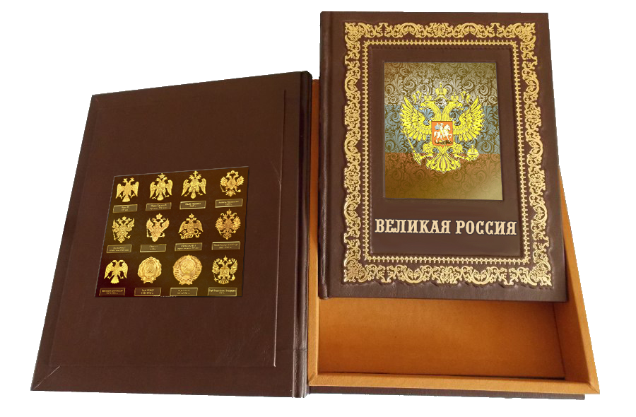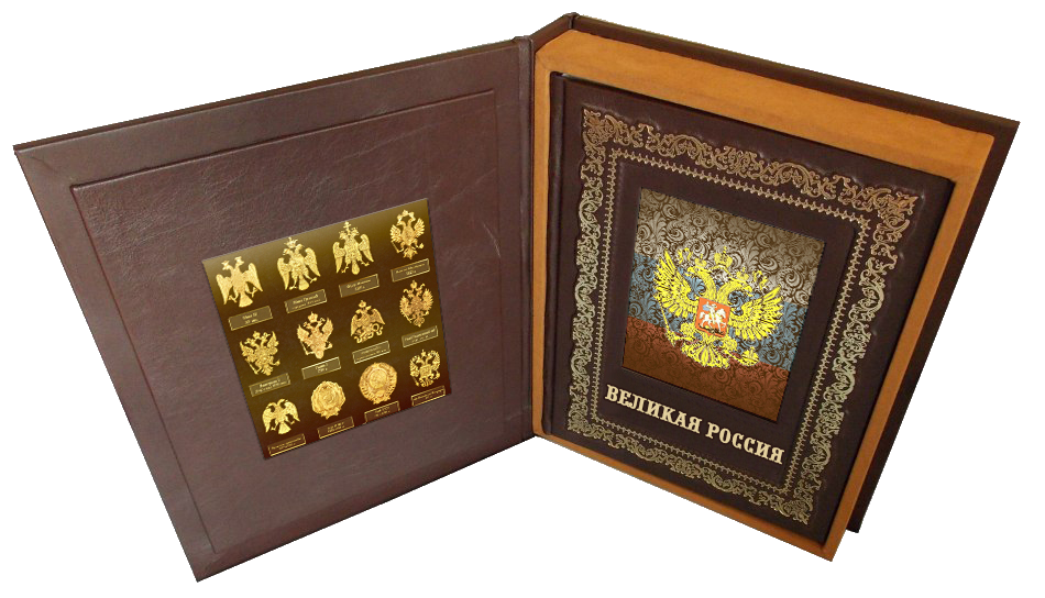 Цельнокожаный переплёт ручной работы, украшен иллюстрированной вставкой из цветного металла.