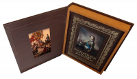 Цельнокожаный переплёт ручной работы, украшен иллюстрированной вставкой из цветного металла.
