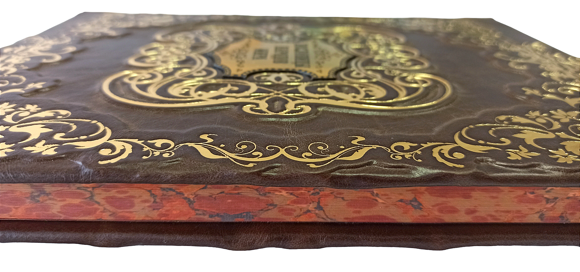 Цельнокожаный переплёт ручной работы, украшен вставкой из цветного металла с золотой печатью.Блинтовое и золотое тиснение.