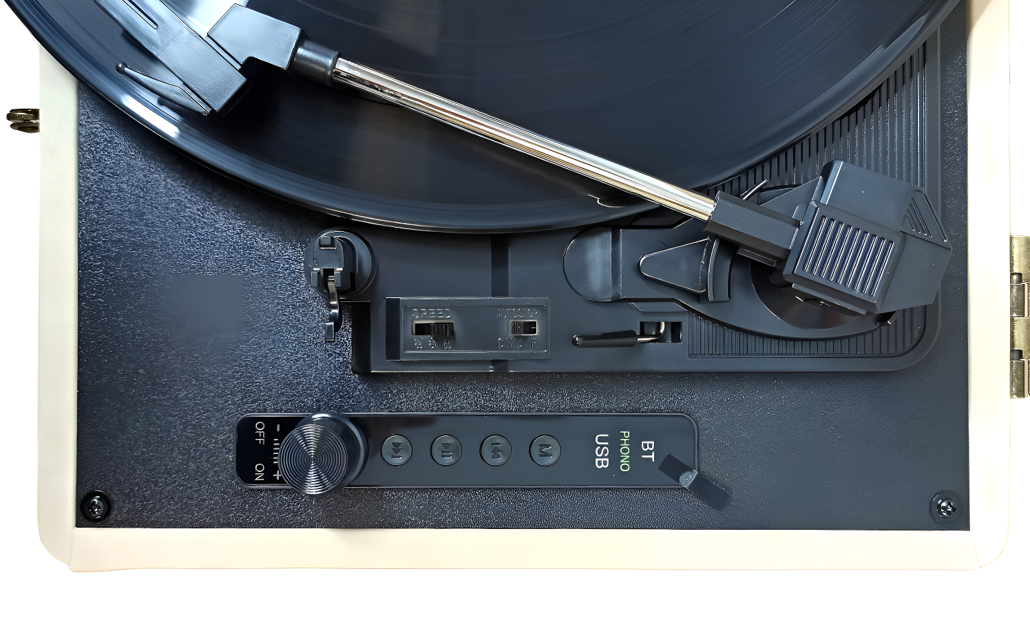 Проигрыватель виниловых дисков с автостопом поддерживает 3 скорости (33, 45 и 78 об/мин)