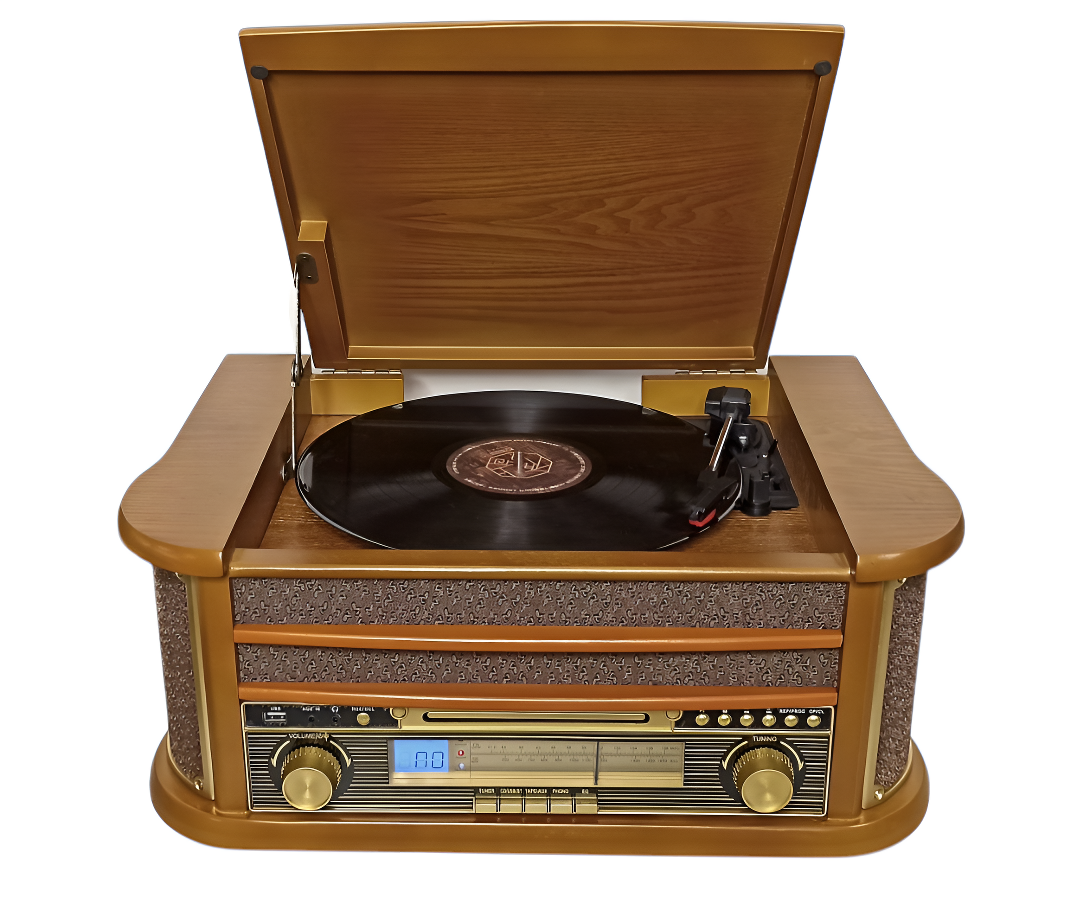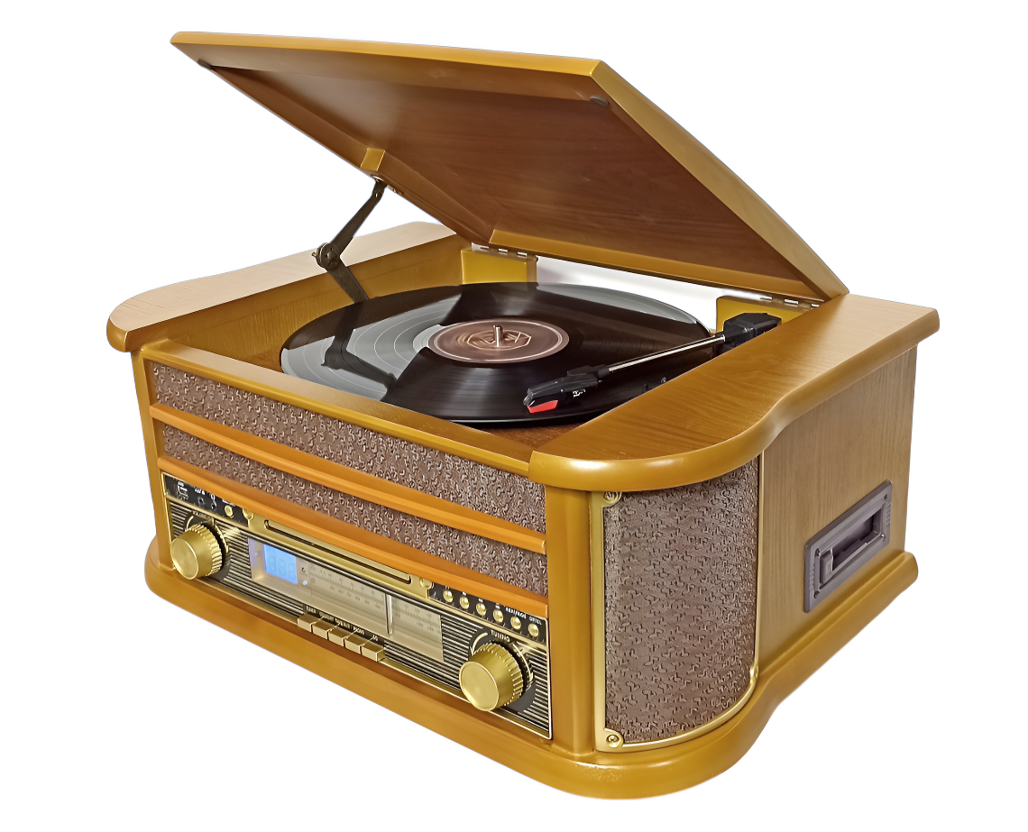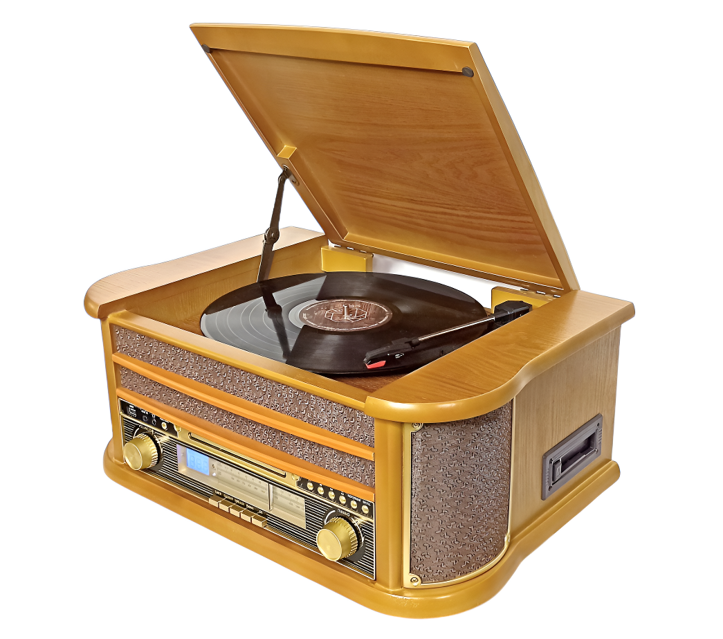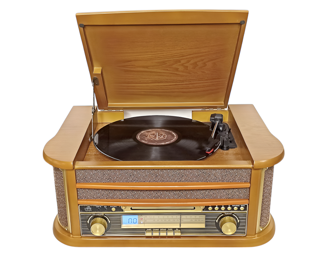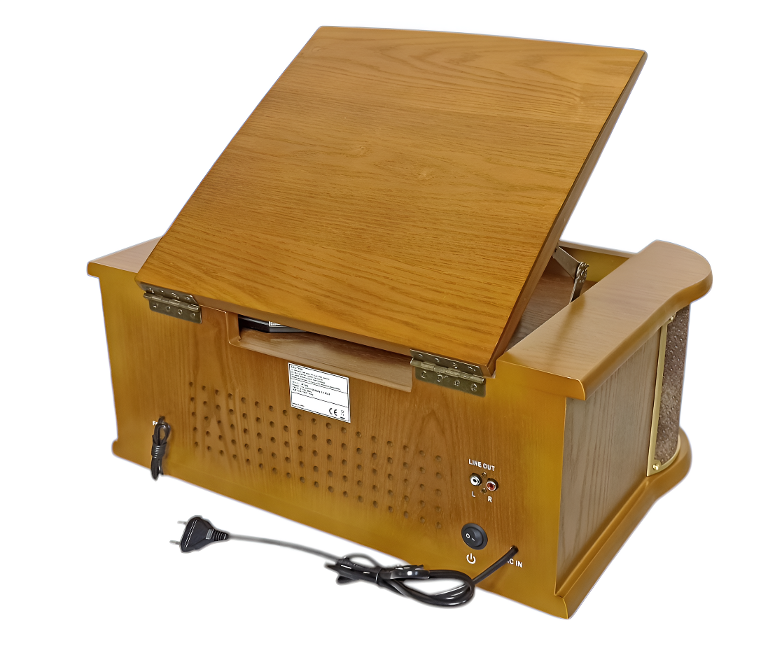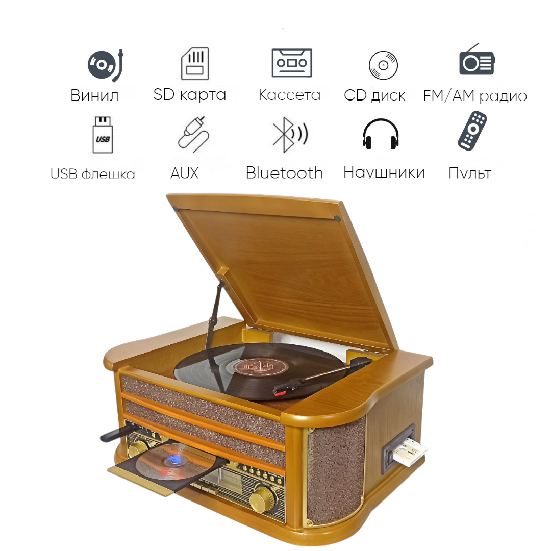 Устройство включает проигрыватель виниловых пластинок с функцией подъёма тонарма, скоростями вращения 33, 45 и 78 оборотов в минуту и функцией «АВТОСТОП».