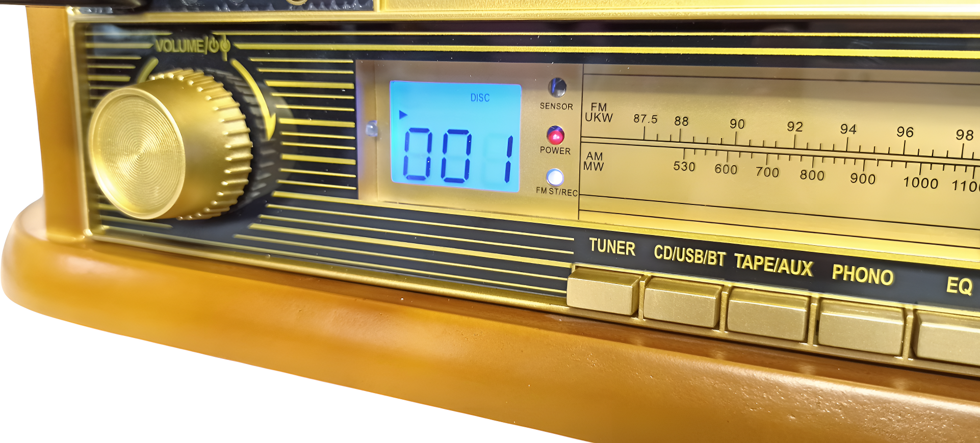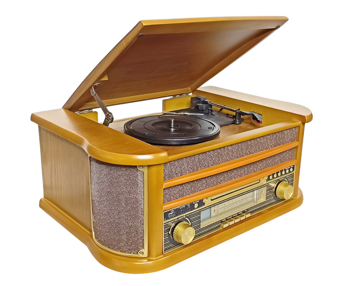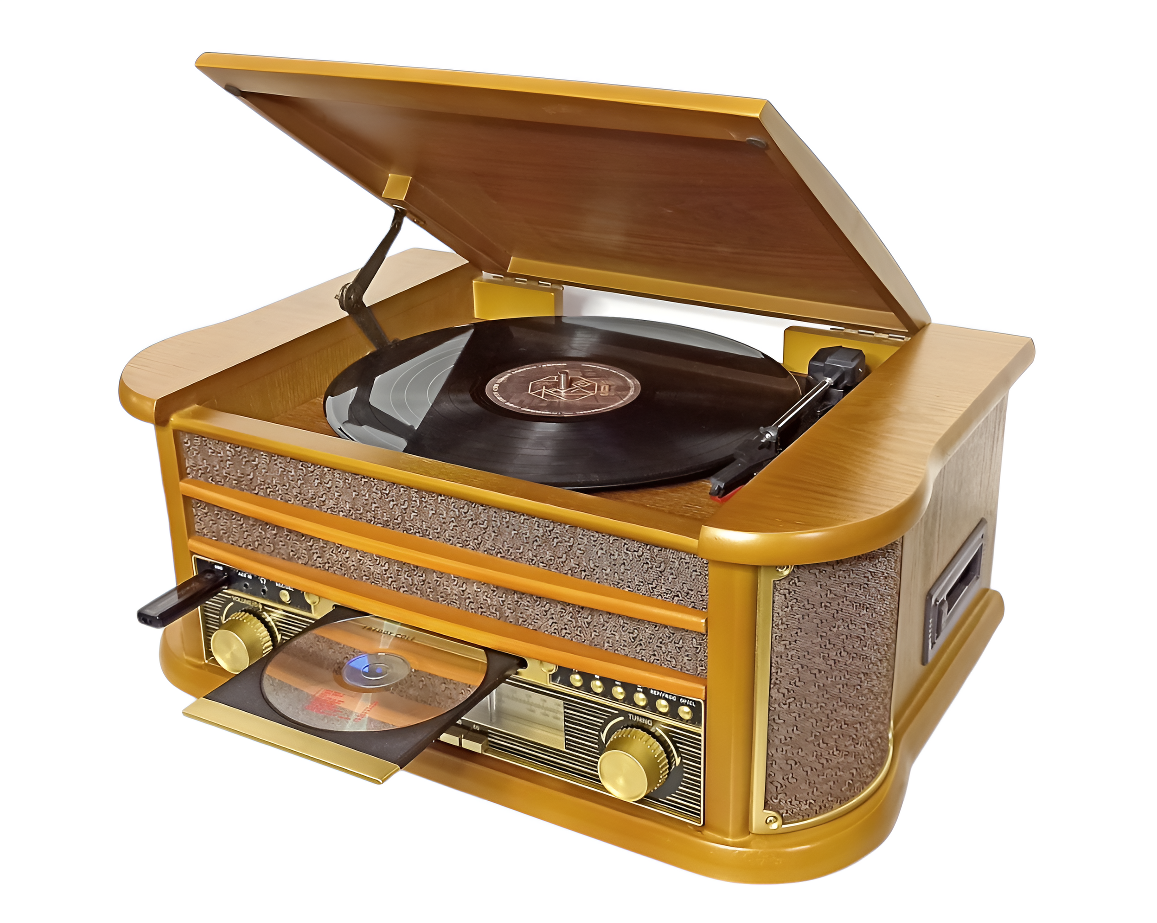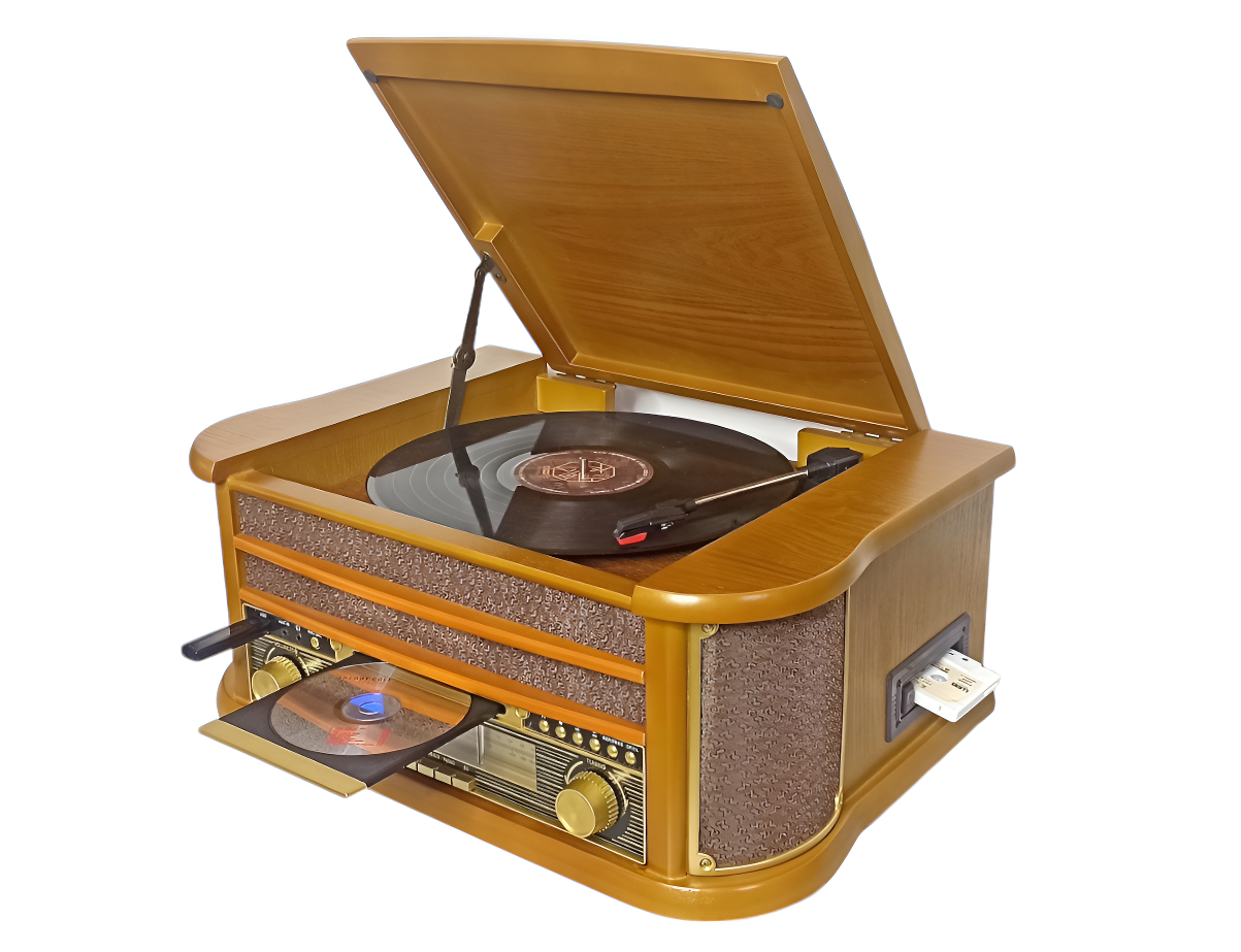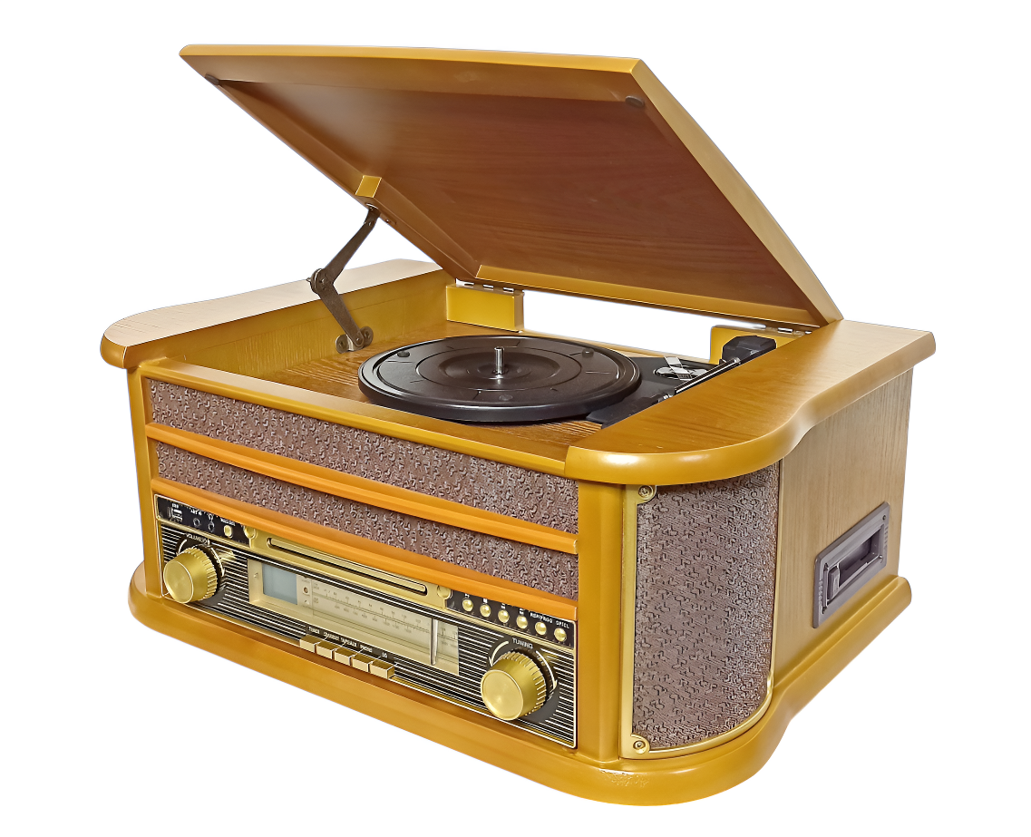Устройство включает проигрыватель виниловых пластинок с функцией подъёма тонарма, скоростями вращения 33, 45 и 78 оборотов в минуту и функцией «АВТОСТОП».