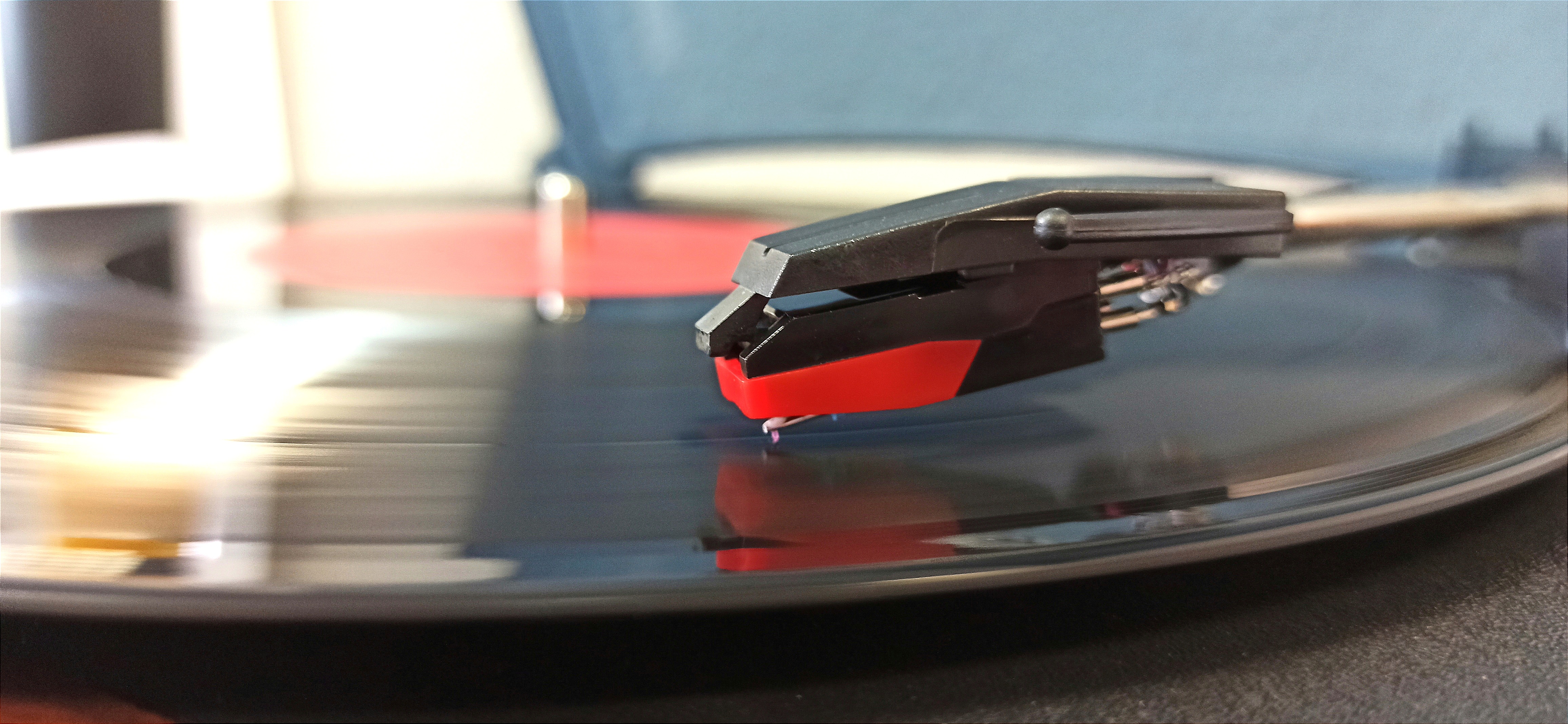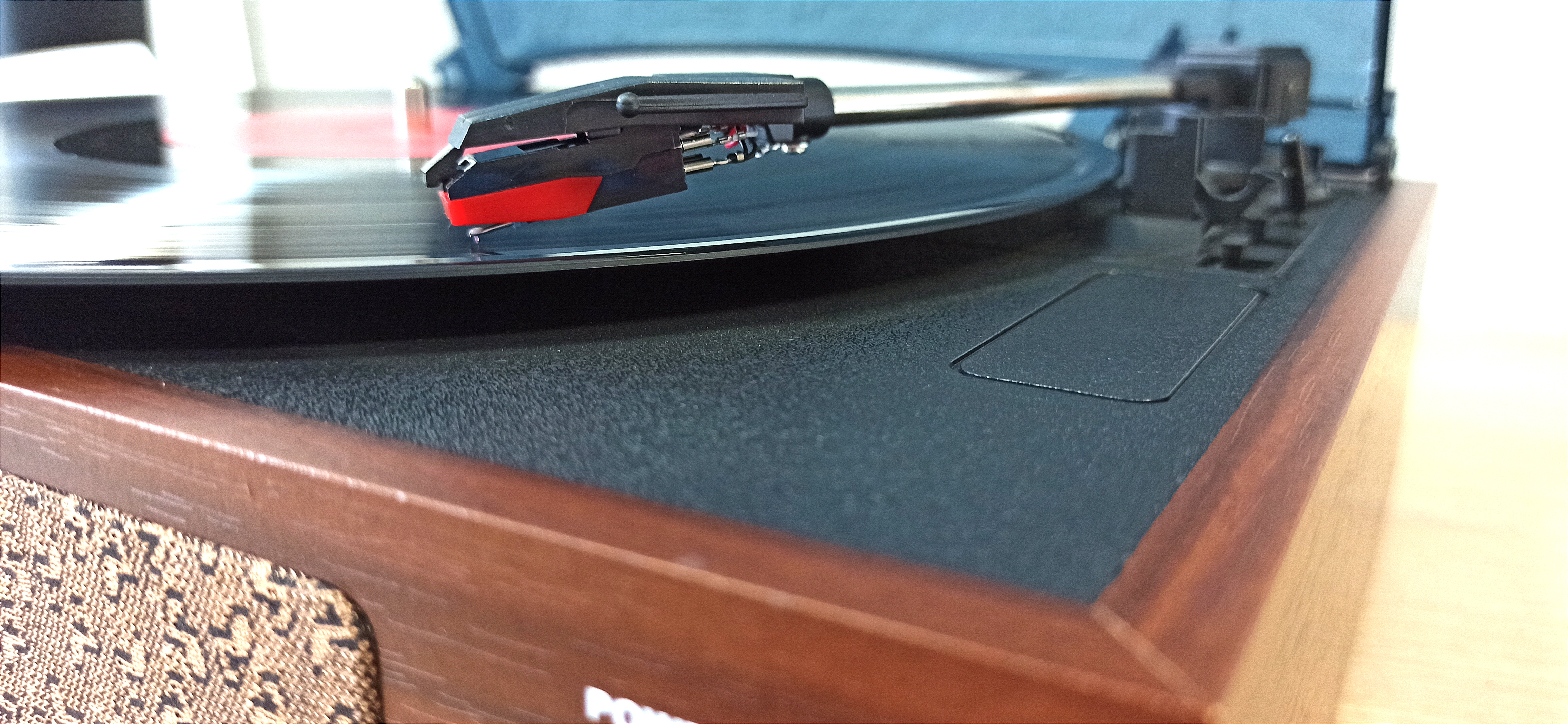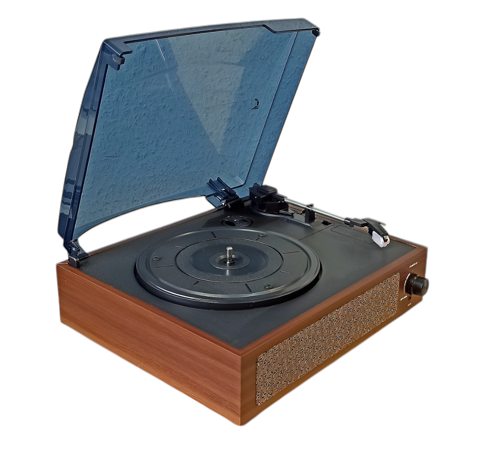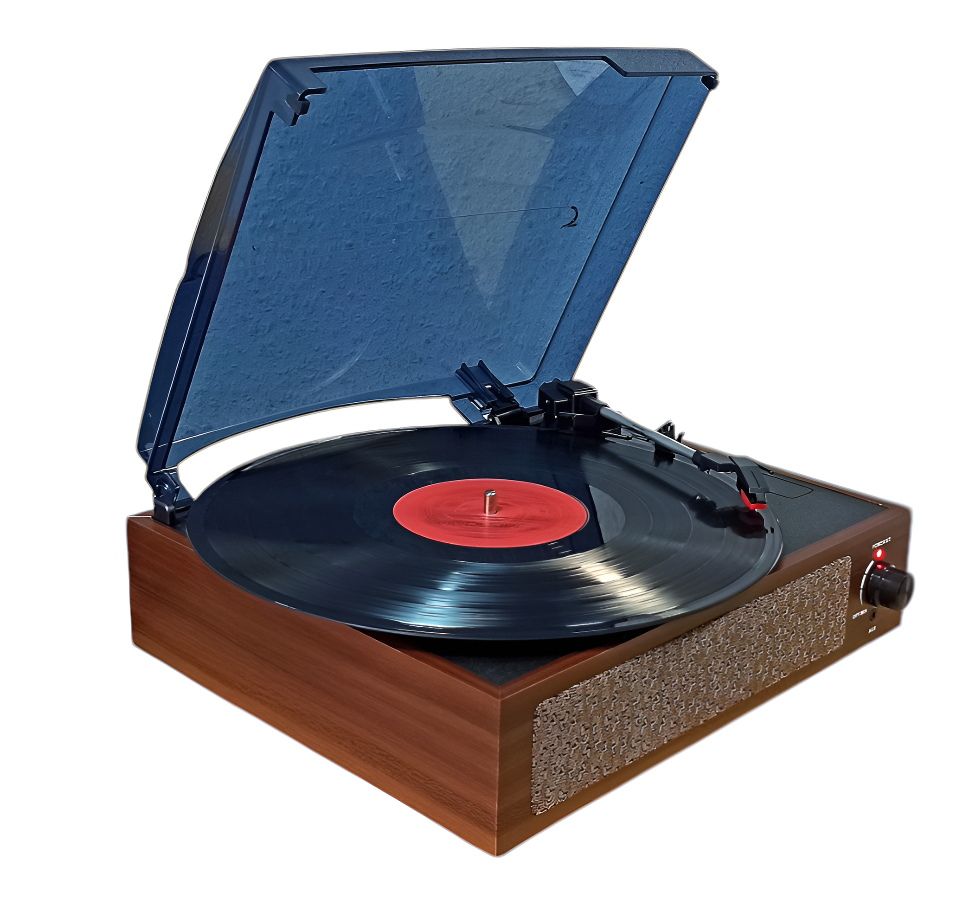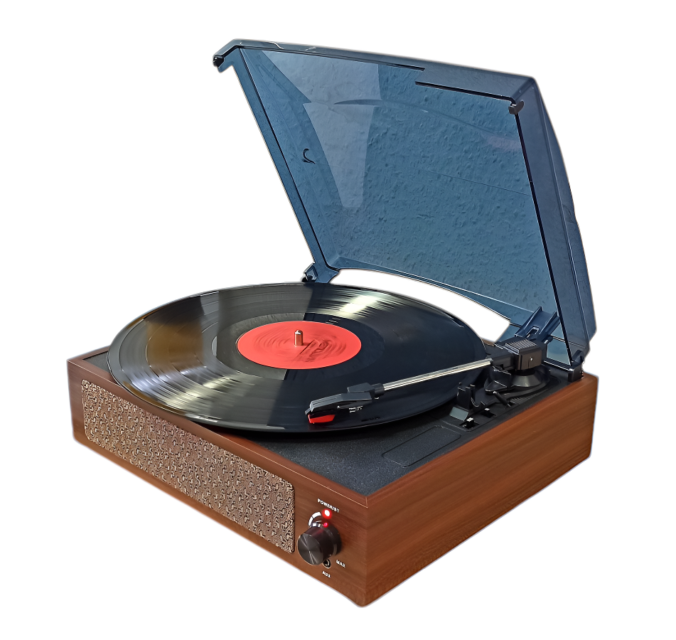 Портативный, ультра-компактный проигрыватель для виниловых пластинок, выполненный в стиле ретро.