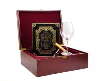 Так же в набор входит винный бокал и штопор, оформленных в деревянной коробке, обтянутой кожей.