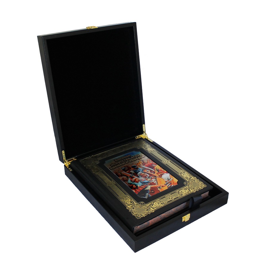 Дизайн прекрасно сочетает в себе золотое и бинтовое тиснение, художественную металлическую вставку, соответствующую тематике издания, а также крашенный в тон переплетного материала обрез.
