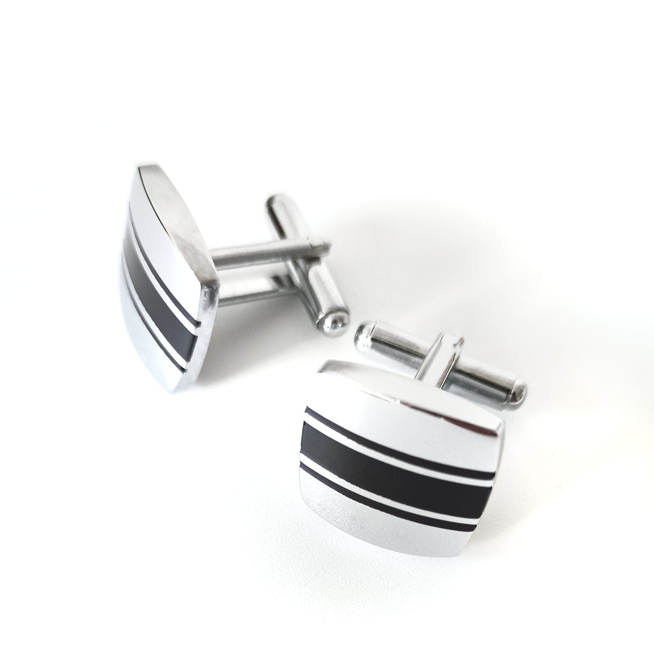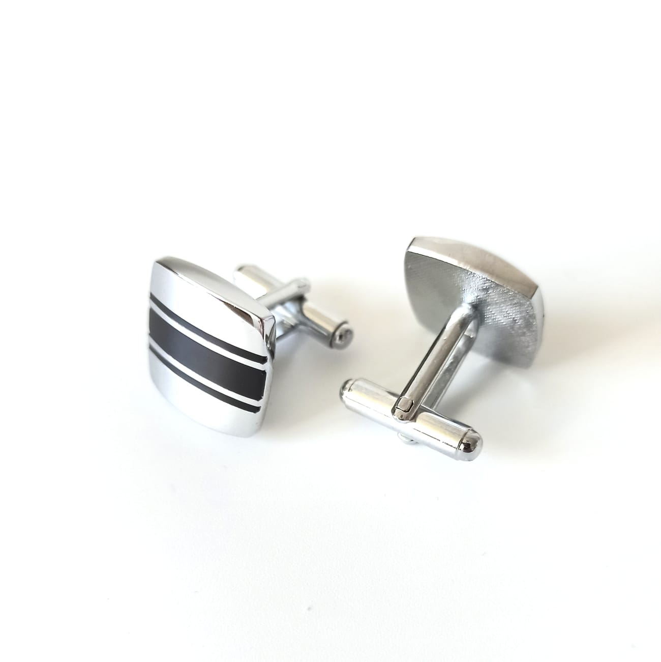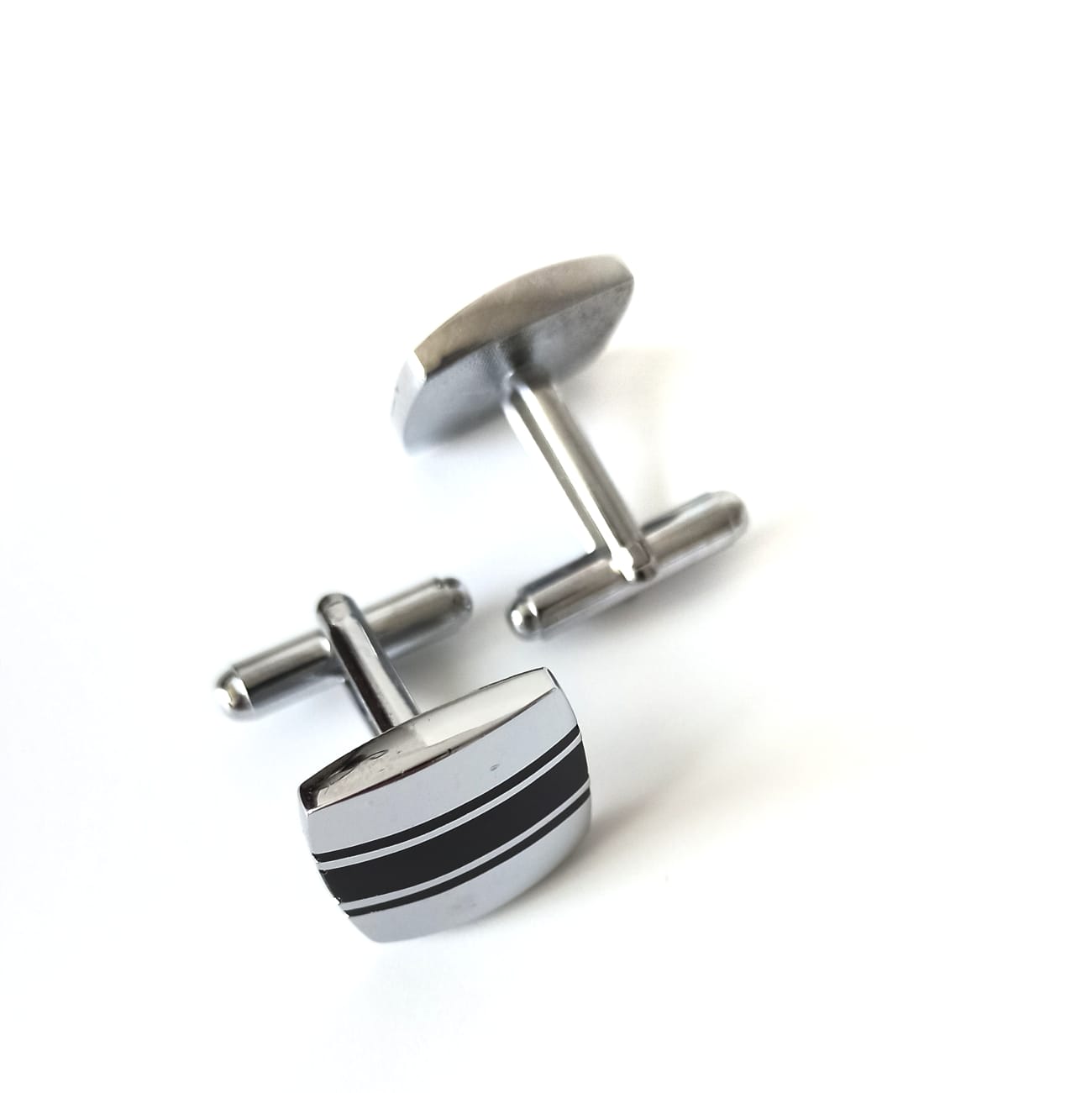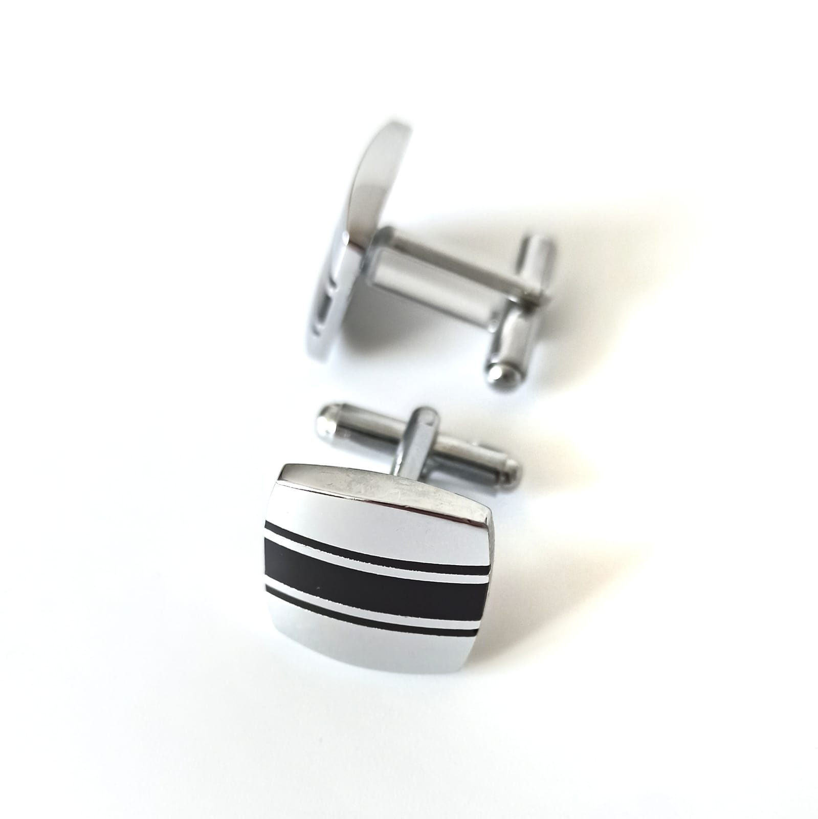 Запонки выполнены из ювелирного сплава с нанесением полосок горячей эмалью черного цвета.