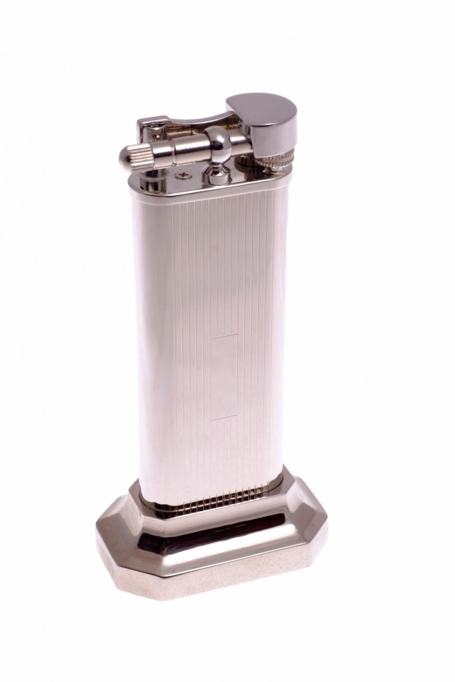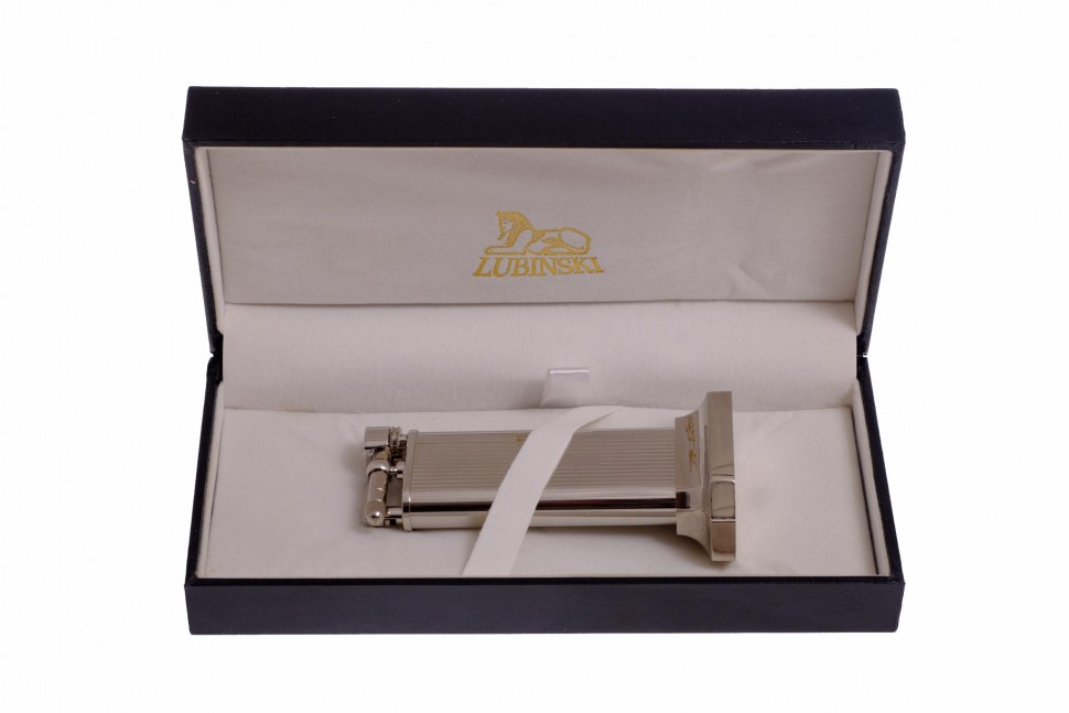 Газовая настольная зажигалка итальянской компании Lubinski. Механизм с кремневой системой поджига от японского производителя Tsubota. Массивный корпус из латуни с анодированием позолотой или серебрением. Подарочная упаковка.