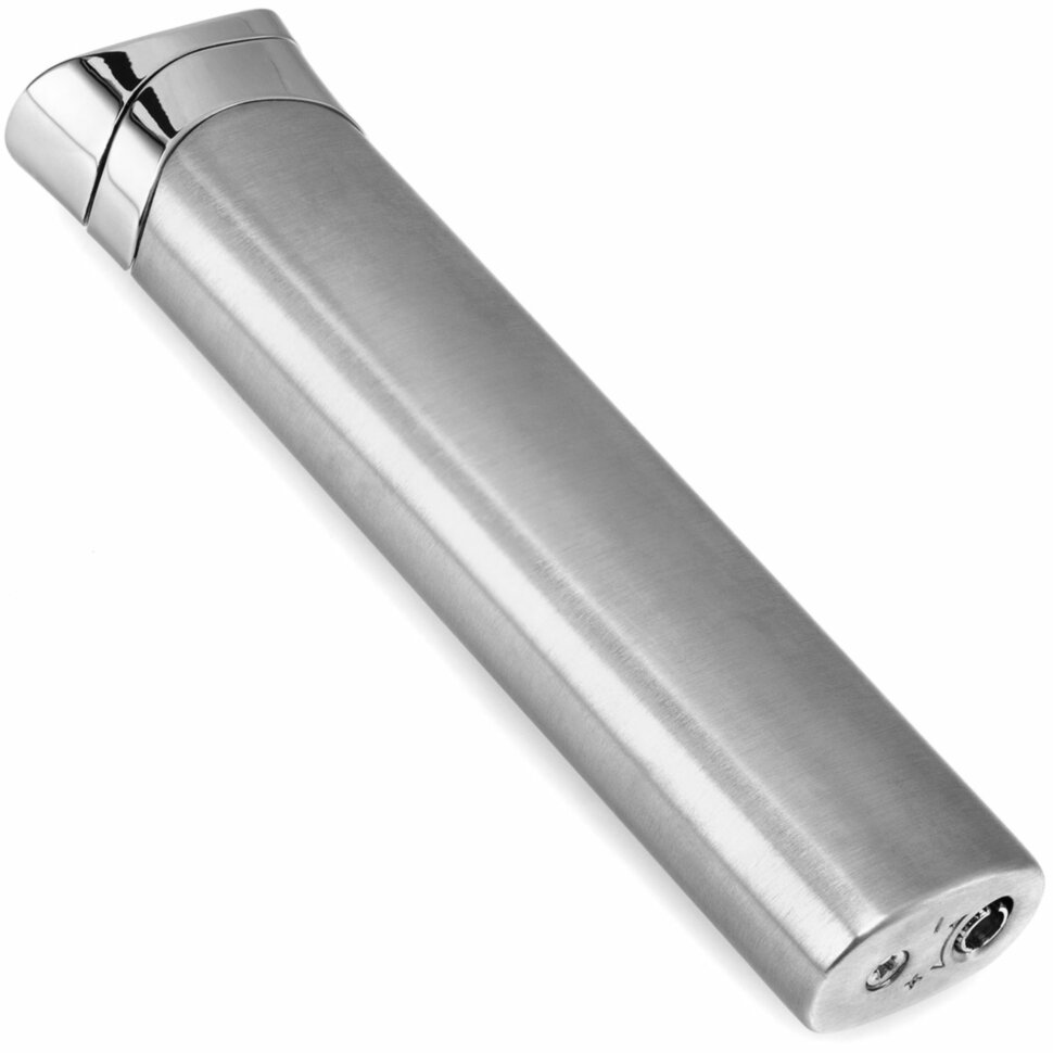 Тонкая элегантная зажигалка с кнопкой для пьезоподжига и регулятором подачи газа.
