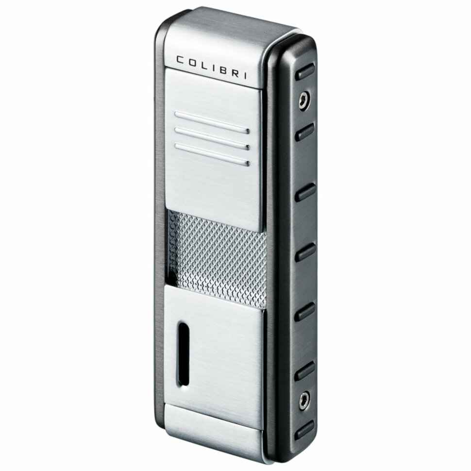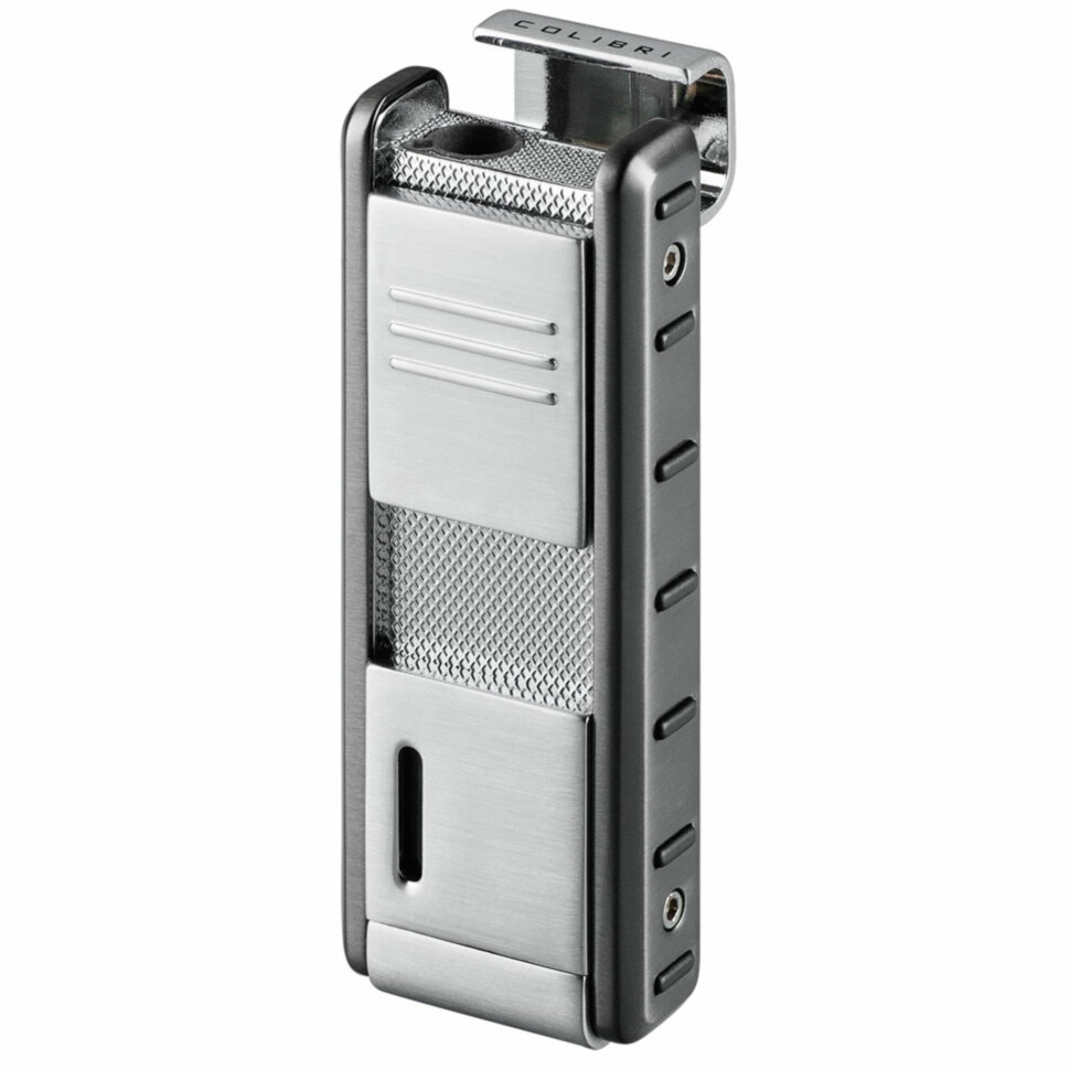 Зажигалка газовая Colibri Futura Satin Silver & Gunmetal Lacquer с турбо-пламенем, сделана из металла.