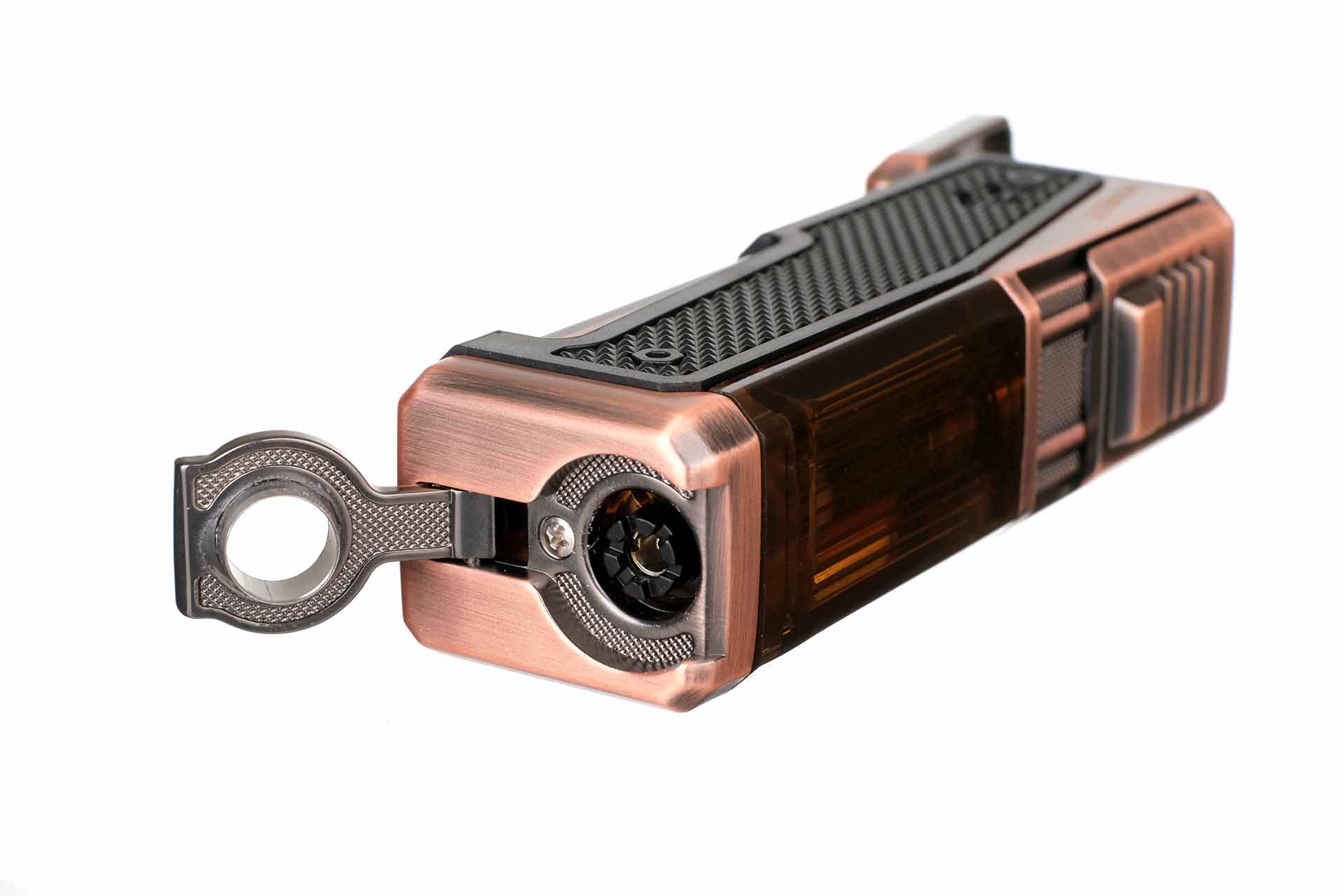 Массивная сигарная газовая зажигалка с мощным турбо-пламенем из четырех форсунок. Снизу в корпус встроен пробойник диаметром 8 мм. Корпус выполнен из металла и пластика с антискользящим покрытием Pachmayr для удобного хвата. Полупрозрачный корпус для контроля уровня газа внутри. Увеличенные вентиляционные отверстия по бокам обеспечивают более стабильное пламя даже при сильном ветре. Зажигалка может служить настольной подставкой для сигары, благодаря плоскому дну и ложементу на крышке. В комплекте подарочная упаковка и инструкция по эксплуатации.