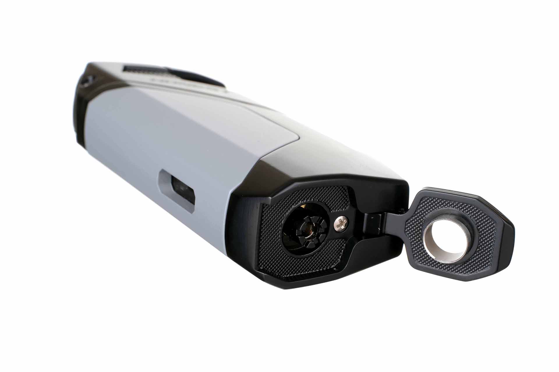 Сигарная газовая зажигалка с двойным турбо-пламенем и встроенным пробойником диаметром 8 мм. Корпус выполнен из металла и пластика с антискользящим покрытием для удобного хвата. Имеется окошко для контроля за уровнем газа внутри. Увеличенные вентиляционные отверстия по боком обеспечивают более стабильное пламя даже при сильном ветре. В комплекте подарочная упаковка и инструкция по эксплуатации.