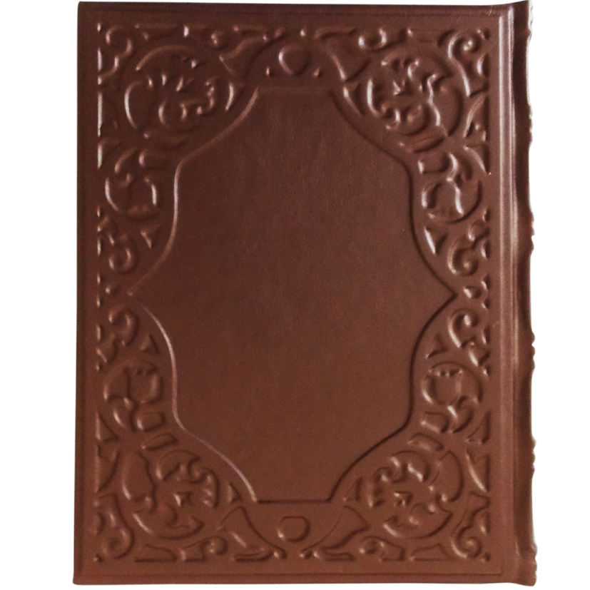 Цельнокожаный переплёт ручной работы, украшен иллюстрированной вставкой из цветного металла.