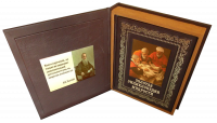 Цельнокожаный переплёт ручной работы, украшен иллюстрированной вставкой из цветного металла.